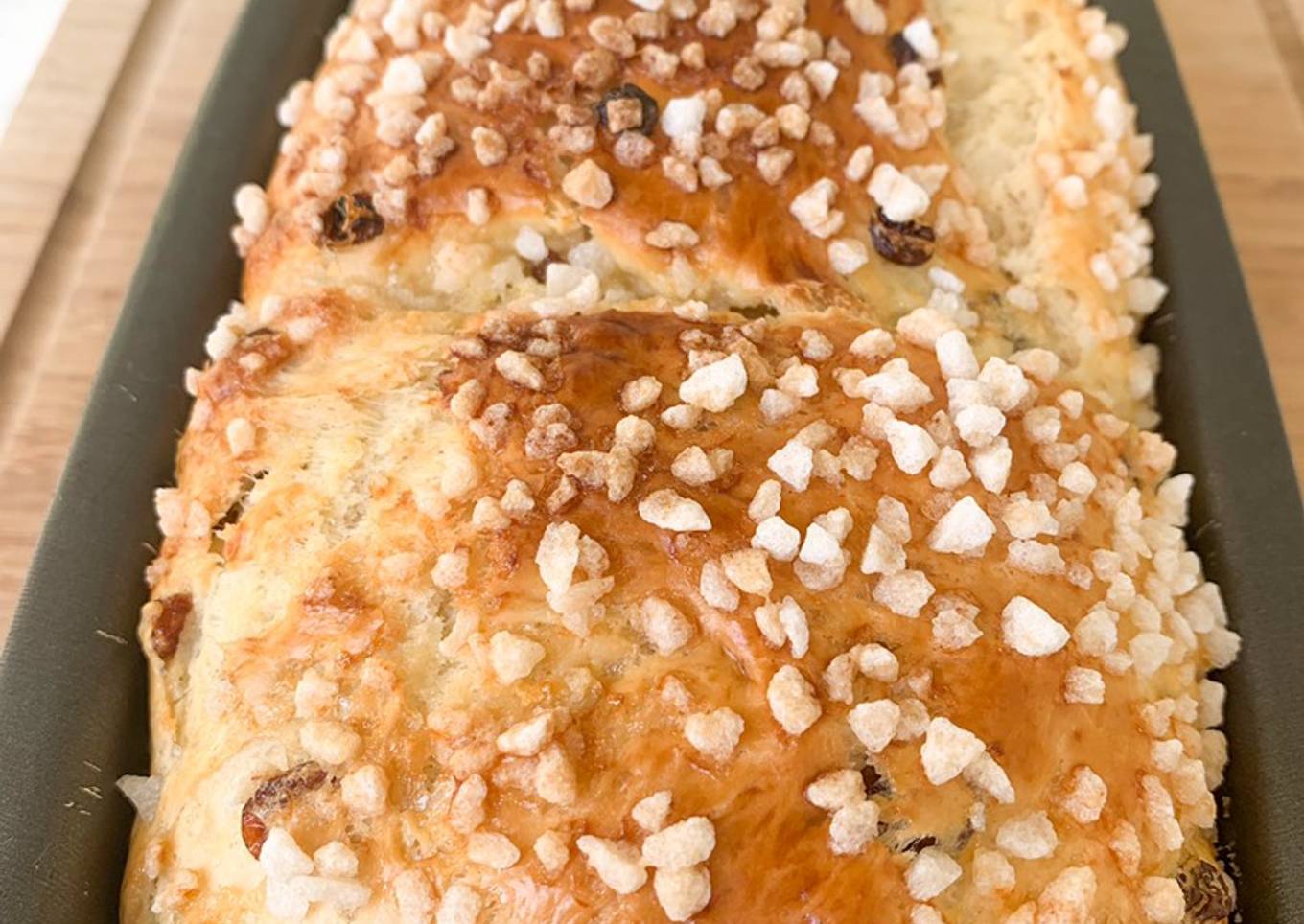 Un pain brioché belge agrémenté de raisins secs et ou de sucre perlé.