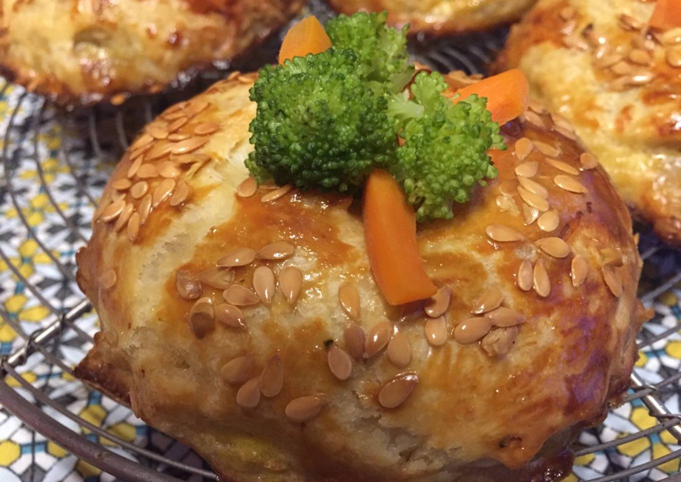 - Découper des cercles de pâte feuilletée. Mettre sur un cercle de pâte un peu de préparation, puis refermer avec un autre cercle de pâte. Souder à l'eau. Faire une croix dans le haut, ouvrer pour faire une sorte de cheminée.