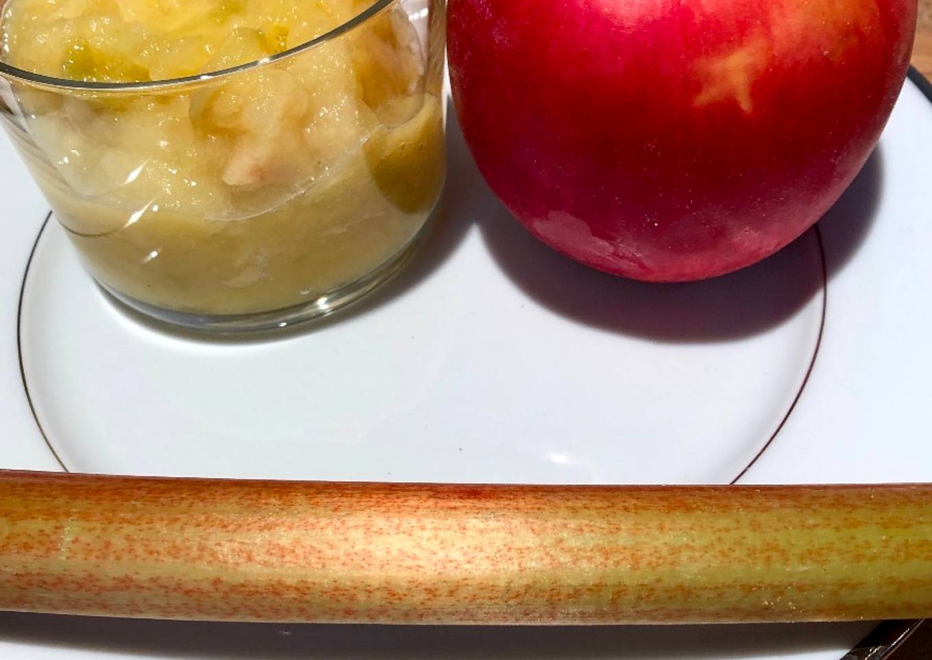 - Peler les pommes et les couper en morceaux, éplucher la rhubarbe et la découper. Dans une casserole avec un petit peu, ajouter les fruits et le sucre et faire chauffer une vingtaine de minutes. Quand les fruits sont tendres, les écraser à la fourchette ou au mixer. Déguster.