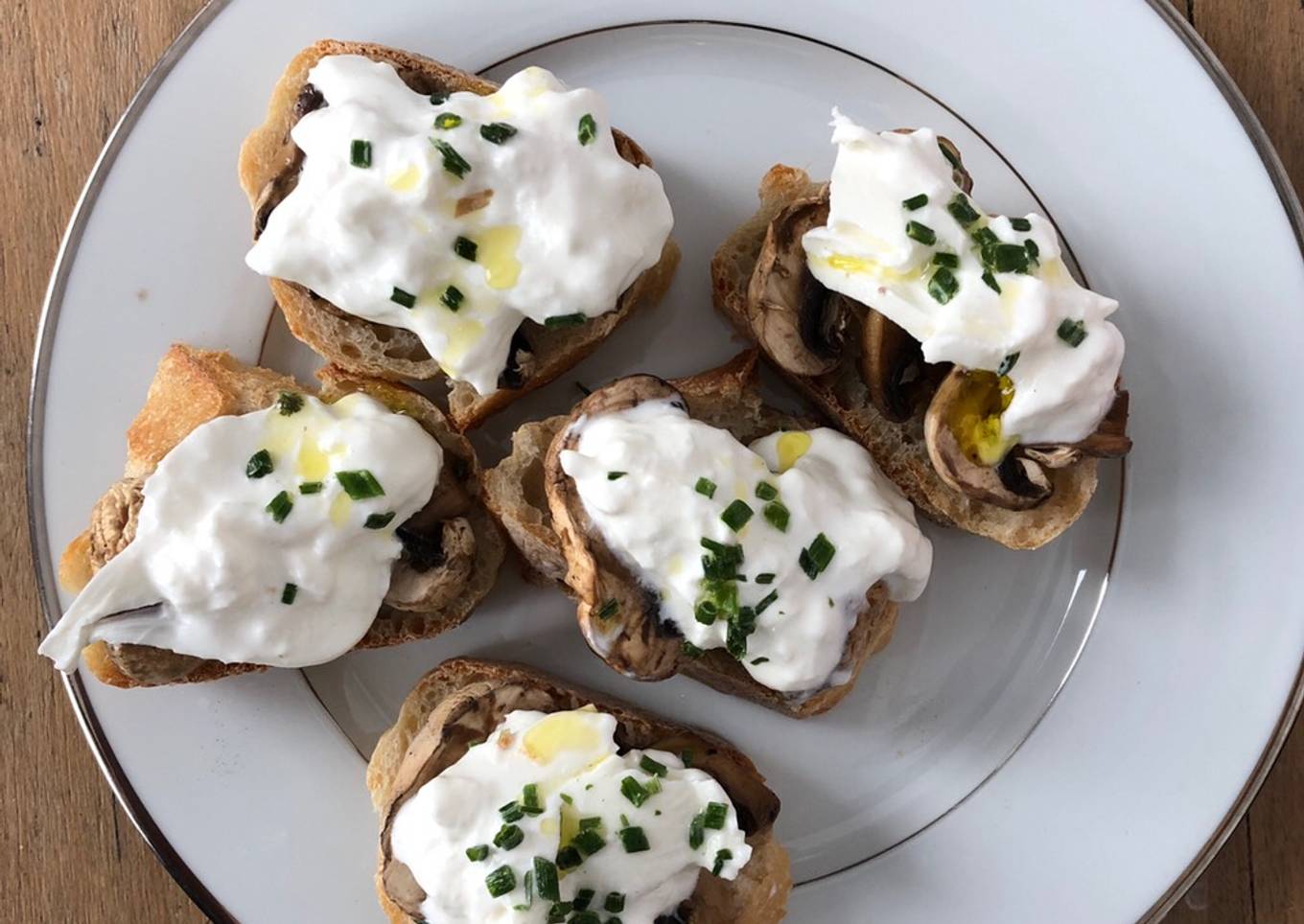 - Garnisser les tranches de pain de champignons, puis de burrata, Saler, poivrer, arroser d'un filet d'huile d'olive et de thym ou romarin, ciboulette. Déguster.