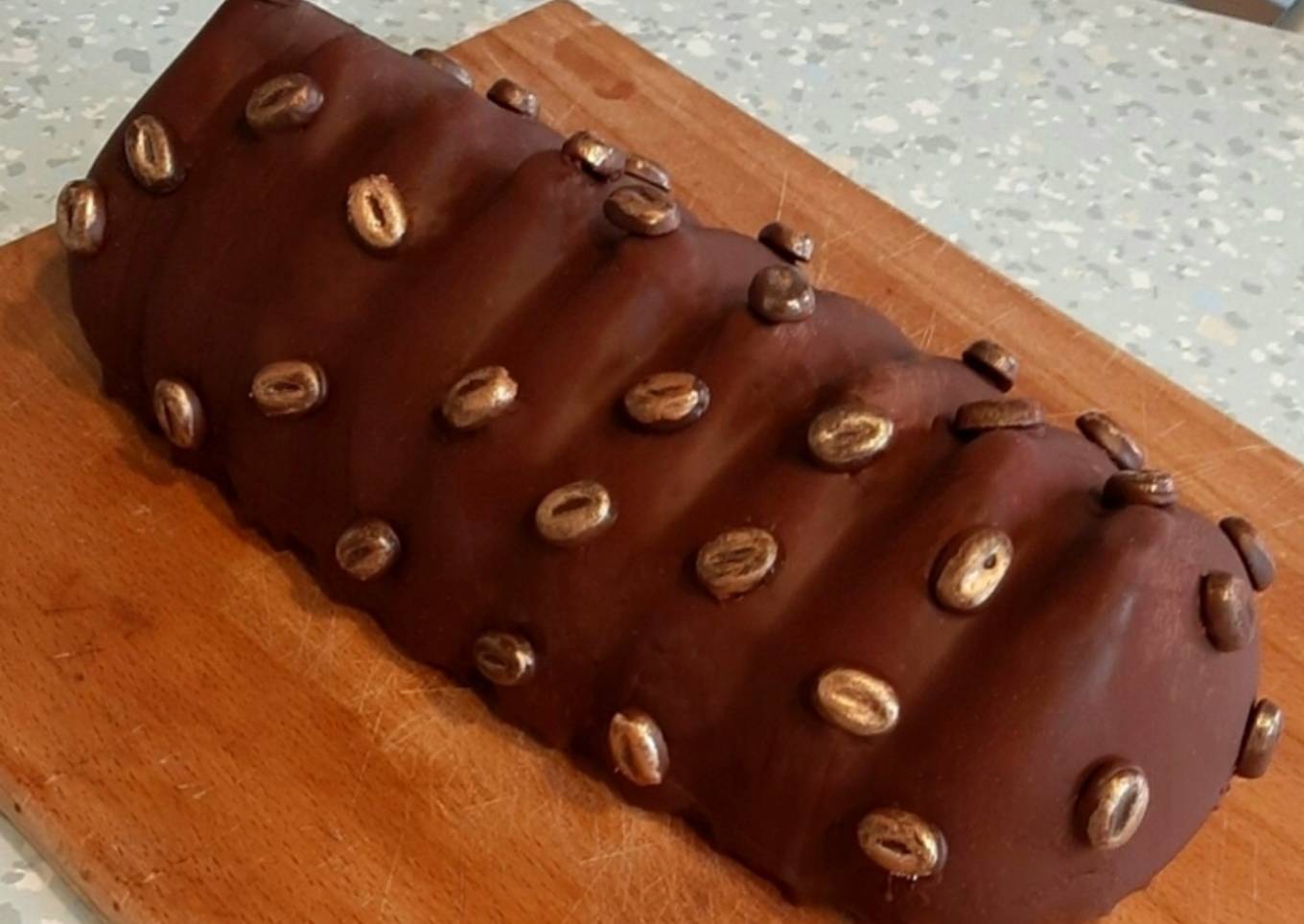 - Récupérer la bûche congelée et la poser sur une volette avec un plat en-dessous pour récupérer l'enrobage