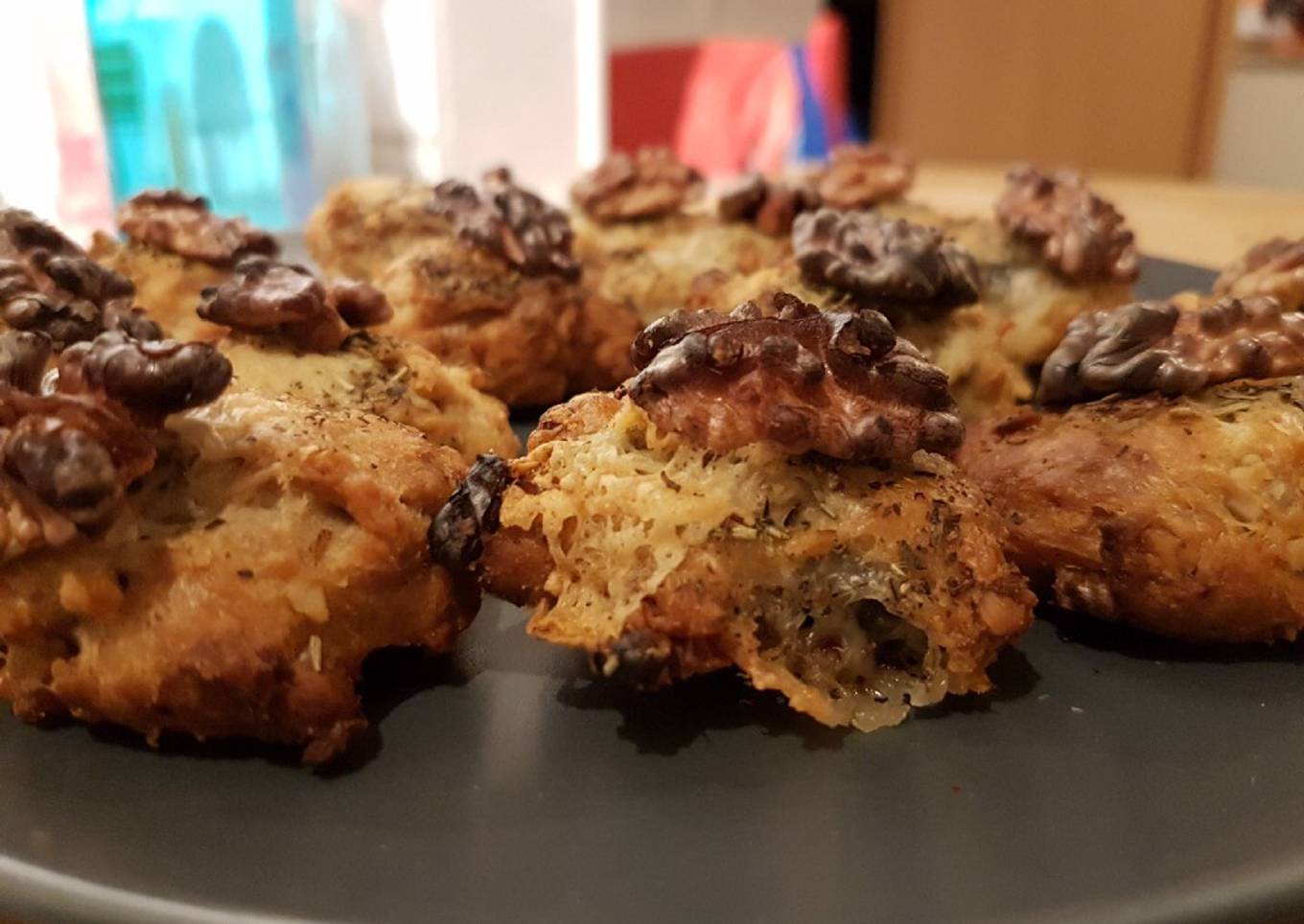 - Sur une plaque recouverte de papier cuisson, déposer des petites boules de pâte et les aplatir. Bien les espacer pour éviter que les cookies ne fusionnent à la cuisson. Recouvrir les cookies d'herbes de Provence et d'un cerneau de noix.