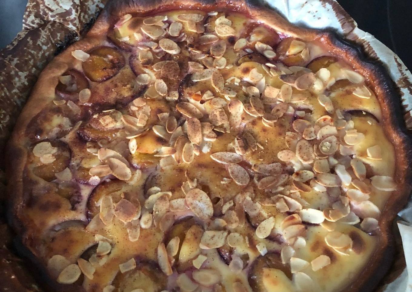 - Sortez la tarte du four, parsemez d'amandes effilées et de la cannelle.